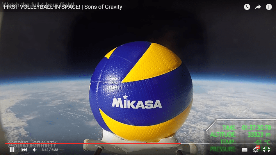 Deze keer geen ‘epic trick shots’ maar een pseudowetenschappelijke stunt. Ze stuurden met behulp van een ballon een volleybal zowaar de ruimte in. Een intergalactische prestatie. Wat een fotogeniek beeld zo’n volleybal in de ruimte. Als Mikasa een beetje van een marketingafdeling heeft dan haken ze hier toch meteen op in?