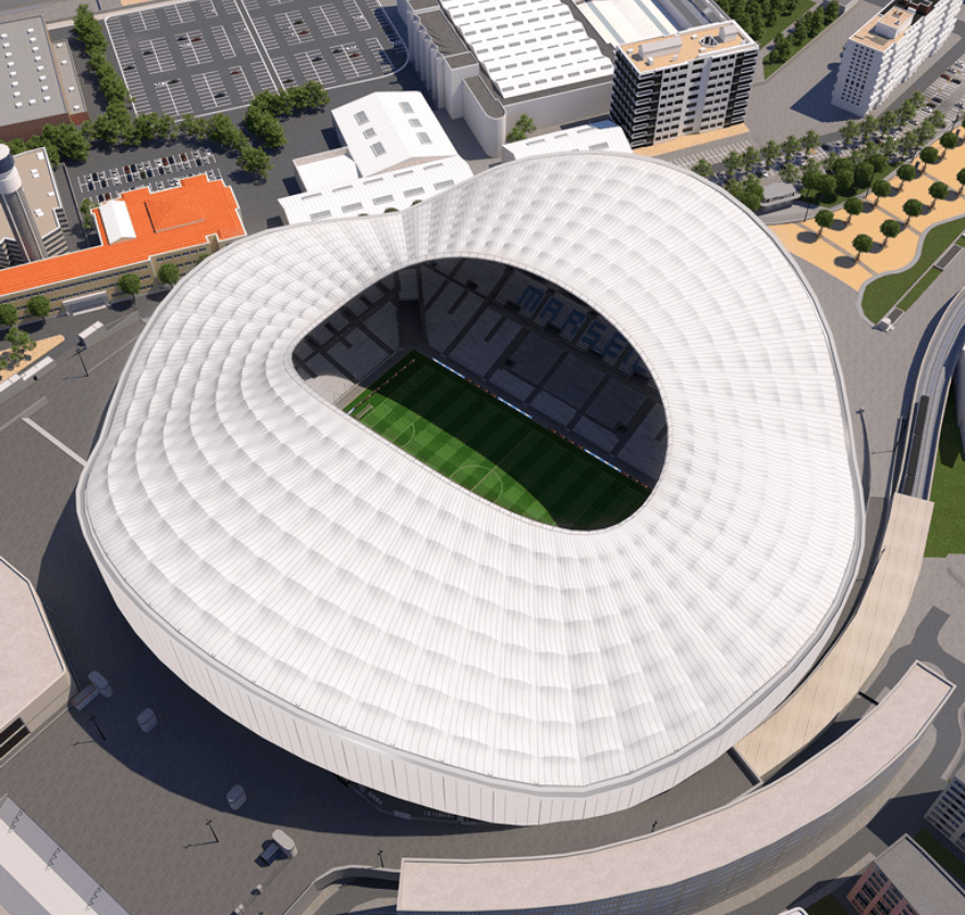 Olympique Marseille speelt in het Stade Vélodrome. Dat is een ruimteschip van boven bekeken: