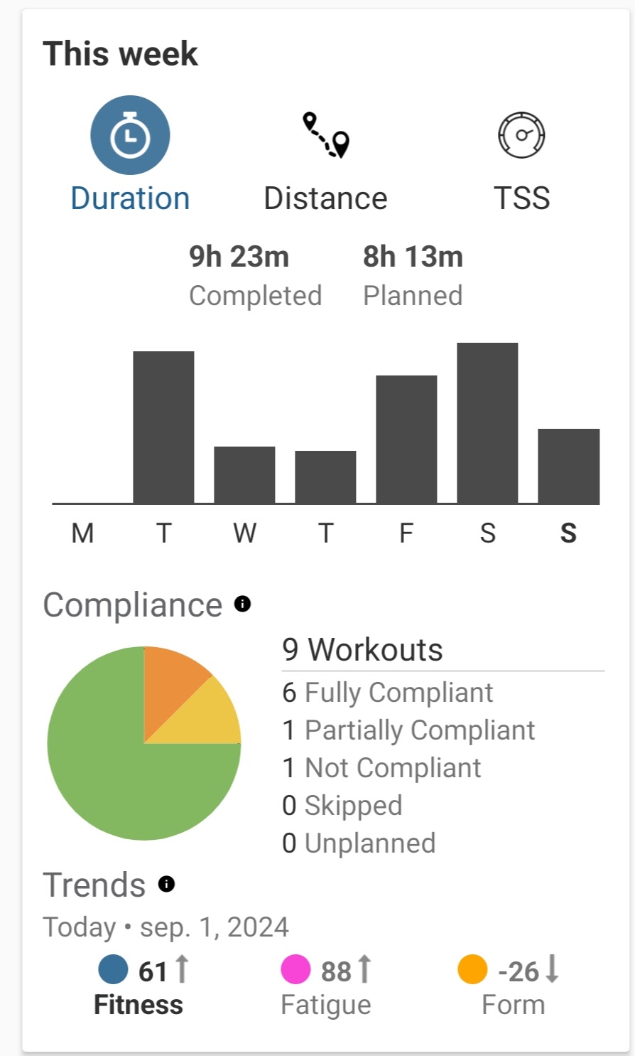 Ik volgde een trainingsschema dat ik kocht via Phil Mosley – MyProCoach: Phil’s Intermediate Olympic Triathlon (6-9 hrs/wk) 12 weeks. Het trainingsplan synchroniseerde automatisch naar TrainingPeak en mijn Garmin Watch.