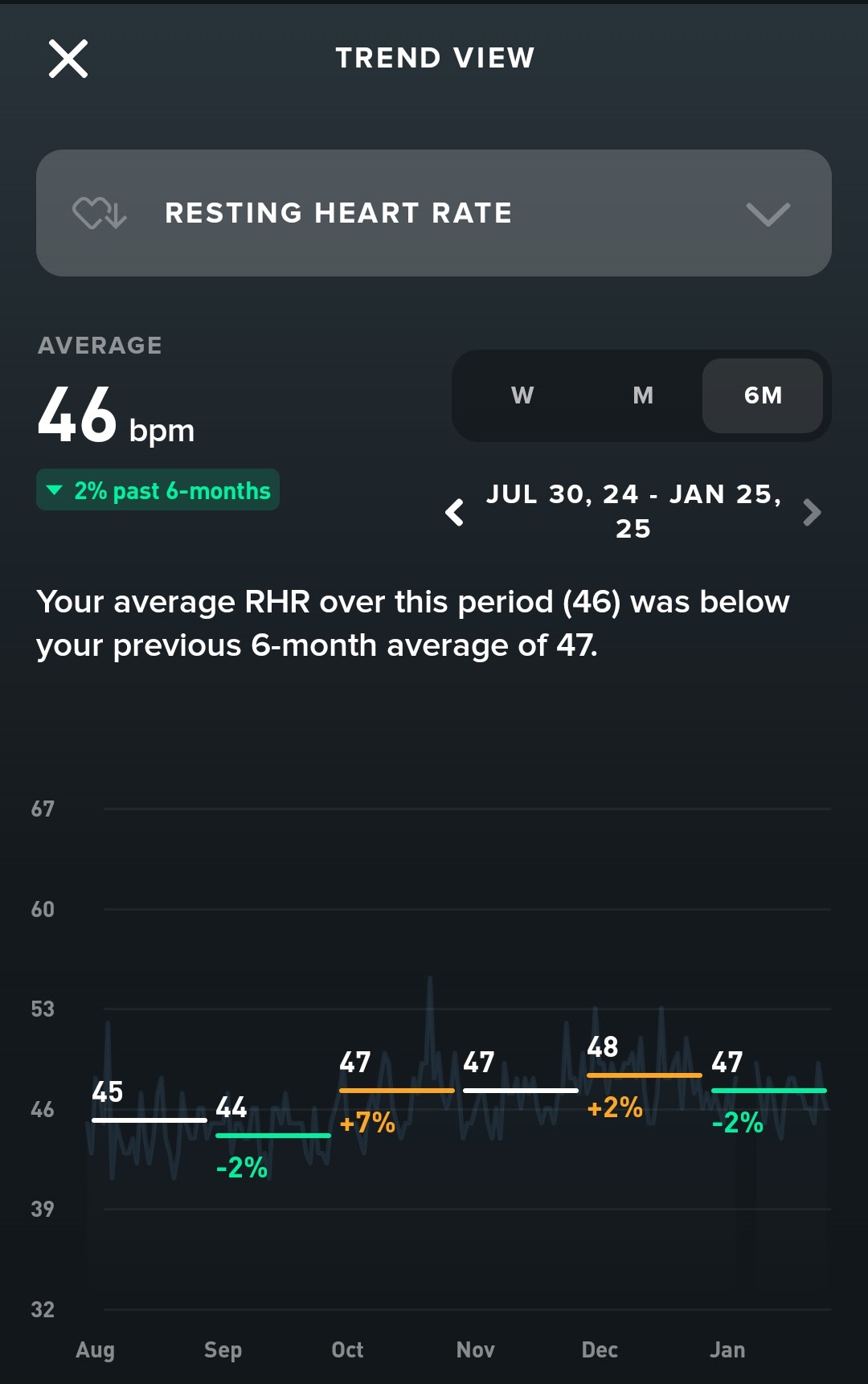 Het schema werkte vorig jaar want ik voelde mij in topvorm op het moment van mijn olympische triatlon. Zowel qua gevoel, als wat mijn Whoop mij vertelde. Offseason betekende wel dat mijn Whoop nerveus werd. Ik bleef nochtans trainen, zonder schema en puur uit plezier, maar het mocht niet baten. Mijn HRV stuiterde naar beneden, mijn RHR piekte omhoog.